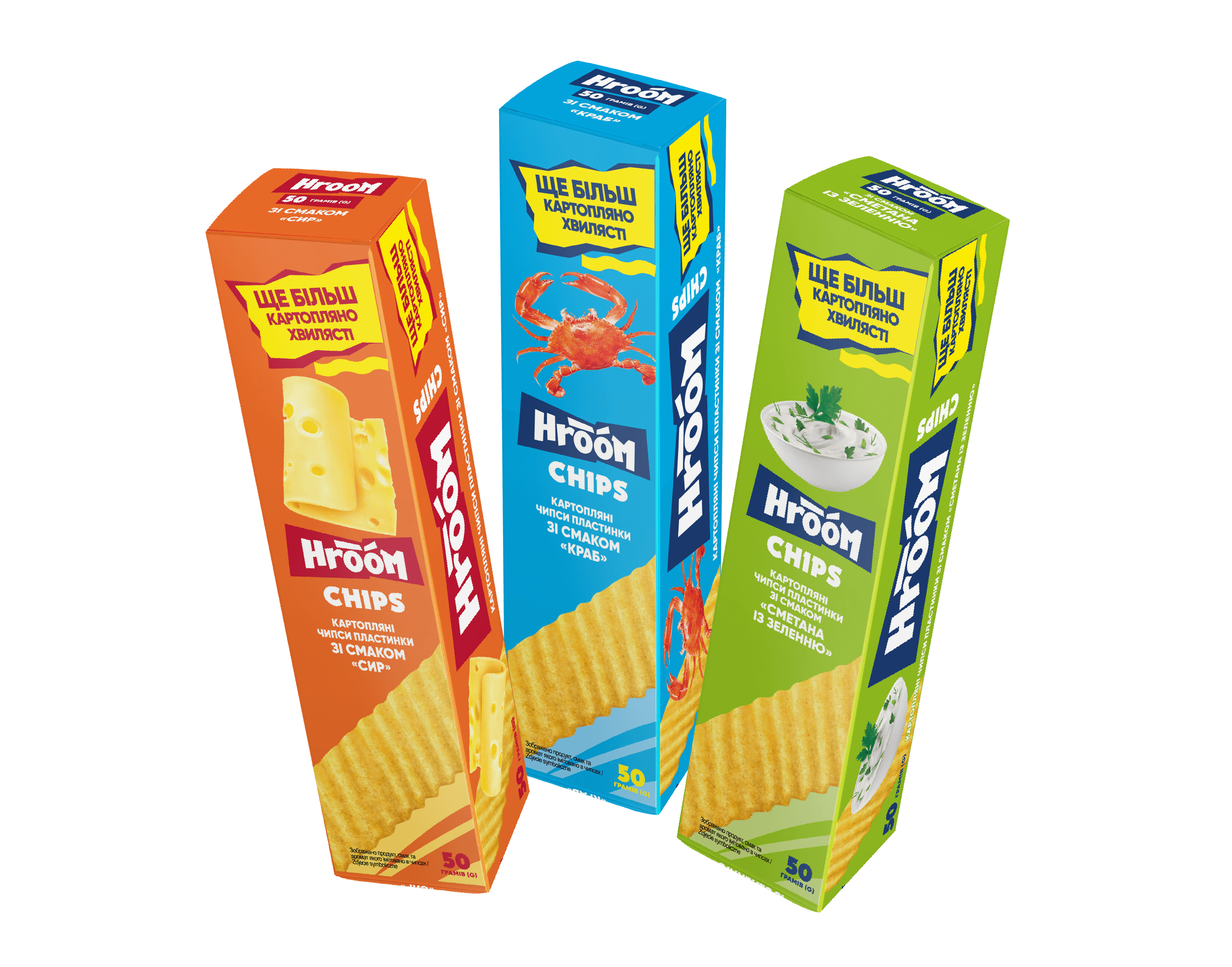 TM HROOM is a bright, stylish, dynamically developing brand that not only adds colour to boring grey everyday life, but also gives a lot of unforgettable positive emotions. HROOM crisps are a snack at a pleasant price that will not leave you indifferent. Due to the special structure and thin proportions of the plates, HROOM chips absorb even more spices.HROOM crisps are your new impressions and vivid experience.
